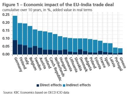 All this means that the short-term effects of the deal on economic activity will be rather limited. Therefore, in this Economic Brief, we focus on the cumulative long-term effects. We model the direct and indirect effects of the announced measures across EU countries. The direct effects refer to direct trade with India. The indirect effects concern the value added created by the EU country concerned in the supply chain for other countries' exports to India. The phased implementation of tariff reductions is taken into account, and we make specific assumptions on the demand response to the resulting price reductions (the so-called price elasticity of demand). The model adopted includes multiplier effects through international production chains using input-output tables and adds an income multiplier.1