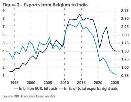 Belgium is among the EU countries where the expected impact is relatively high. This reflects Belgium's relatively large exports to India (as a % of GDP) compared to most other countries. Relative to total exports, India is a small, but not insignificant, trading partner for Belgium. In 2025, India's share was 0.8% of total exports (about EUR 4 billion). This makes India Belgium's 18th most important export market. After the US, China and Turkey, India is Belgium's 4th most important trading partner outside Europe. India's importance in exports did decline significantly over the past decade (figure 2), mainly due to the sanctions on Russian diamonds, which accounted for a third of Belgium's rough diamond imports before the sanctions took effect. This greatly affected the supply of rough stones to Belgium, which traditionally went from Antwerp to India. Along with diamonds (the tariff on processed diamonds going from 5.5% to 2.5%), chemicals (for which the current 22% tariff will be largely abolished immediately) and machinery and equipment (for which the tariff now rising to 44% will be gradually but significantly reduced) accounted for almost two-thirds of total Belgian exports to India in 2025. Their respective shares were 37%, 16% and 10% in 2025.