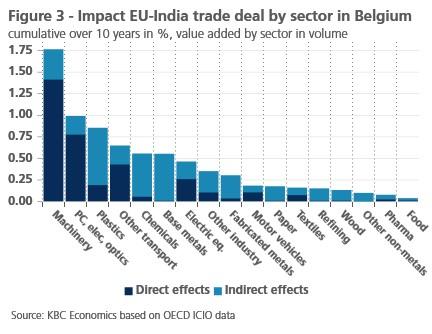 The agreement provides for extensive liberalisation of import tariffs. The EU abolishes tariffs on 90% of tariff lines (91% in terms of trade value). India will do so on 86% of tariff lines (93% in terms of trade value). In addition, both sides will partially liberalise some more tariff lines, bringing the total coverage of trade liberalisation to 99.3% for the EU and 96.6% for India. In this Economic Brief, we estimate the (direct and indirect) impact of the deal on EU economies. For Belgium, which is among the countries where the expected impact is (relatively speaking) high, we also make a sectoral quantification.