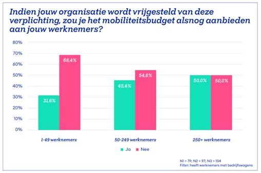 Kleinere bedrijven hebben meer weerstand tegen het mobiliteitsbudget dan grotere ondernemingen. Zes op de tien ondernemingen met minder dan 50 werknemers zijn zelfs ronduit tegen een verplicht mobiliteitsbudget. Zeven op de tien (68,4%) kleine kmo’s zouden het ook niet aanbieden als het niet voor hen verplicht is of wordt. Maar bij werkgevers met 50-249 werknemers zakt dat aandeel al naar 54,6%. Bij grote werkgevers (250+) zou exact 50% het wel doen en 50% niet.
