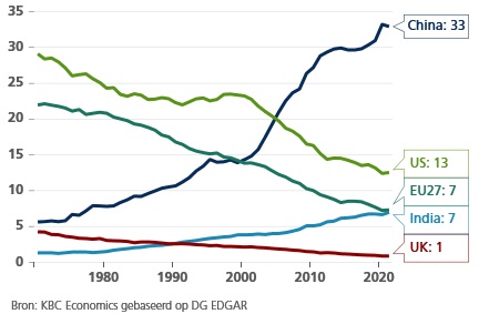 Il se passe donc actuellement beaucoup de choses en coulisses, mais il faudra attendre le premier trimestre de 2024 pour connaître la proposition d'objectif pour 2040. Certains signes montrent cependant que l’objectif sera à nouveau ambitieux et se rapprochera déjà de l’objectif de zéro émission nette de 2050. L’UE entend clairement continuer à jouer son rôle de pionnier dans la transition climatique. Malheureusement, ces efforts ne porteront leurs fruits que si les coûts de la transition restent faibles. Les coûts physiques du changement climatique dépendent en effet non seulement des mesures prises par l’UE, mais aussi des politiques menées ailleurs dans le monde. Le bloc ne représente en effet « que » 7 % (voir le graphique) des émissions de CO2 fossile mondiales (ou 9 % si l'on tient compte des émissions provenant des importations).