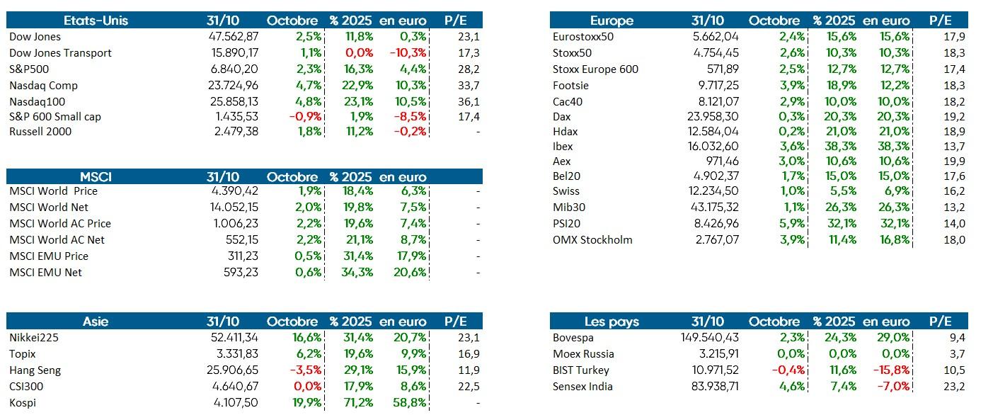 Malgré l'avertissement de Jamie, les marchés d’actions mondiaux ont encore gagné du terrain allègrement, portés par les investissements massifs dans l'IA et par la baisse des taux d'intérêt opérée par la Réserve fédérale (Fed). Sur les marchés d'actions européens, l'optimisme a un peu perdu de sa superbe et les indices ont moins bien performé.
