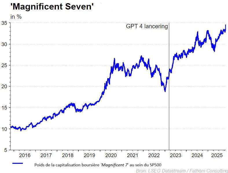 Les géants de la tech continuent de faire fluctuer les marchés boursiers. Les résultats trimestriels des grandes technologiques américaines ont entraîné de fortes variations de cours. Alphabet (Google) a dépassé les attentes avec plus de 100 milliards de dollars de chiffre d'affaires, tandis que Meta et Microsoft ont déçu. Meta a chuté de 11% après une importante dépréciation, et Microsoft a lâché 3% en raison des coûts liés aux investissements dans l'IA. Le Nasdaq et le S&P 500 ont vivement réagi. Les résultats remettent en question la durabilité du rally des‘Sept Magnifiques’. Ces sept actions reflètent néanmoins toujours plus de 30% de la valeur de marché totale du S&P 500. La barre des 35% n'est plus qu'à deux doigts (voir graphique). Où cela s'arrêtera-t-il?