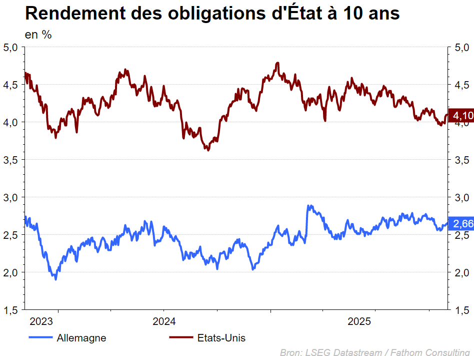 Le taux du Bund allemand à 10 ans a baissé au cours du mois pour atteindre 2,55% environ le 21 octobre. Les investisseurs ont cherché des refuges plus sûrs compte tenu des doutes concernant l’ampleur de la dette américaine et la croissance mondiale. Les taux français se sont également redressés après avoir culminé à 3,60% et ont baissé à 3,30%. Les taux à long terme demeurent néanmoins sensibles à l'augmentation de la dette publique et à l'instabilité politique dans des pays comme la France. Vers la fin du mois d'octobre, les taux d'intérêt ont de nouveau remonté légèrement, et le taux du Bund est revenu à des niveaux un brin inférieurs, à 2,65%. La courbe des taux de la zone euro est restée relativement stable.