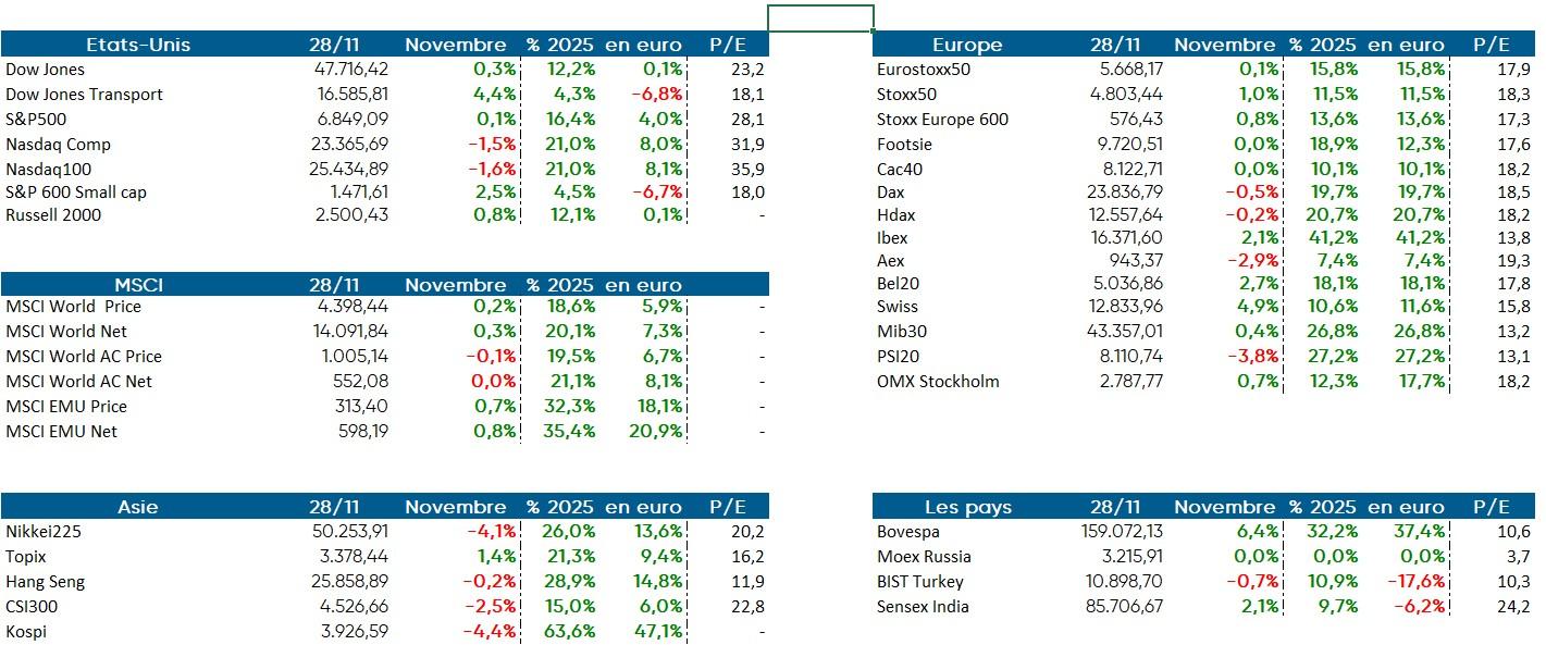 Novembre a été marqué par un abaissement des prévisions de taux, un dollar relativement fort et surtout le soulagement consécutif à la fin du shutdown aux États-Unis. Décembre promet d'être passionnant, d'une part, en raison de l'update des données cruciales sur l'inflation et le marché du travail après le shutdown américain et, d'autre part, en raison de la possibilité d'un nouvel abaissement de taux de la Réserve fédérale..