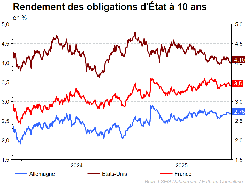 Les taux à long terme sont restés relativement stables en Europe. Le taux allemand à 10 ans s'est établi autour de 2,55%-2,65%, tandis que le taux français à 10 ans oscillait entre 3,25%-3,35%. La BCE signale que le cycle de réduction des taux est probablement terminé, à moins que l'inflation ne chute de manière inattendue.