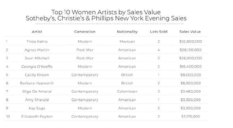 Maar de meest betekenisvolle symbolische gebeurtenis van het seizoen was wellicht de verkoop van Frida Kahlo’s 'El sueño' (La cama) voor 47 miljoen dollar, een nieuw wereldrecord voor een vrouwelijke kunstenaar. Dit werk zat in de collectie van Nesuhi Ertegun, pionier in de jazz- en muziekindustrie en medeoprichter van Atlantic Records. Samen met zijn echtgenote Salma bouwde hij een collectie uit met vooral surrealisten.