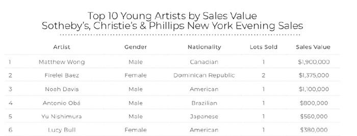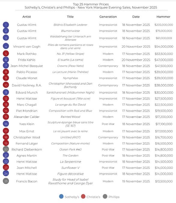 Het contrast met het jongere segment kan nauwelijks groter zijn. Werken van kunstenaars jonger dan 45 jaar leverden dit seizoen een matige 6,1 miljoen dollar op, een daling van 25,6% tegenover 2024, met amper 7 verkochte werken tijdens de avondveilingen. Kopers blijven dus risicobewust: het midden- en instapsegment blijft zwak, terwijl de markt vooral inzet op bewezen kwaliteit en historisch gevalideerde namen. Anderzijds stellen we ook wel vast dat 5 van deze 7 werken afgehamerd werden boven de ingestelde verkoopsprijs.