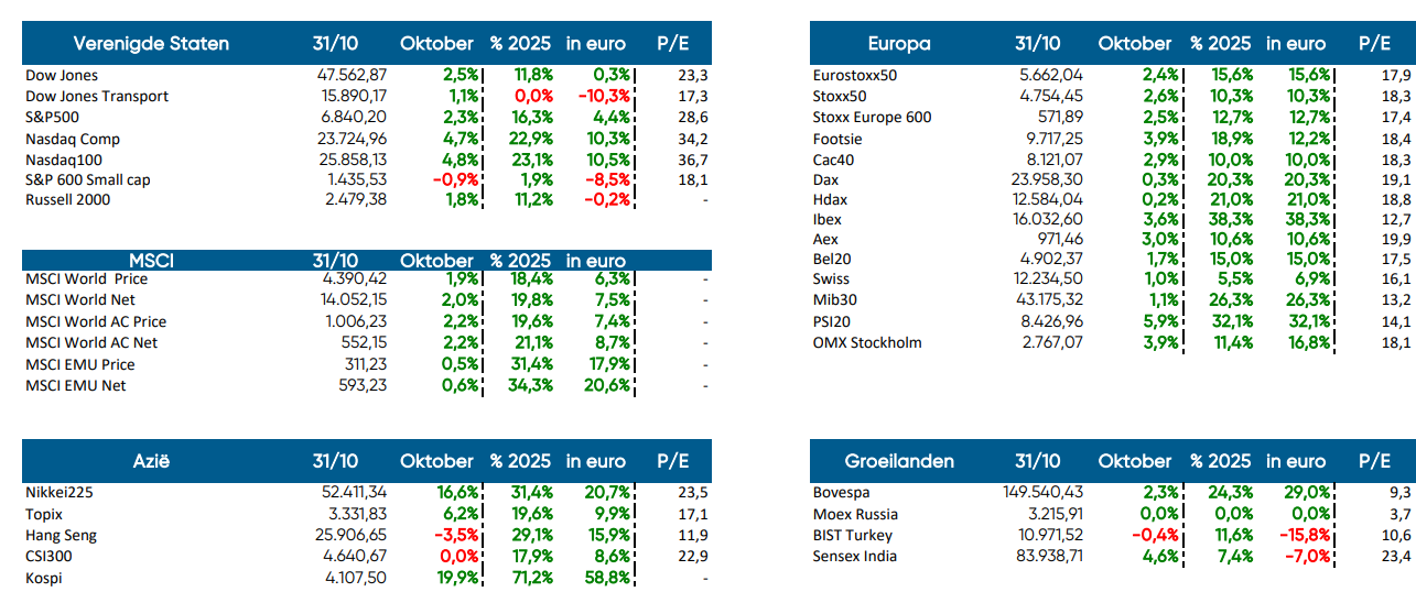 Ondanks de waarschuwing van Jamie, bleven de wereldwijde aandelenmarkten enthousiast stijgen dankzij de sterke investeringen in AI en de renteverlaging door de Federal Reserve (Fed). Op de Europese aandelenmarkten was het optimisme iets minder groot en presteerden de indices meer bescheiden.