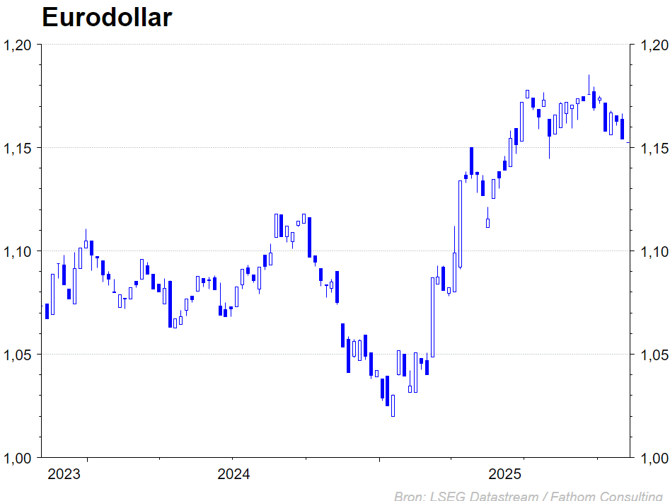 Op de valutamarkt zagen we dat de dollar wisselend presteerde. Aanvankelijk verzwakte de dollar wanneer de Amerikaanse rente daalde en de risico’s toenamen, maar toen de markten eenmaal begonnen te twijfelen aan een snelle versoepeling (renteverlaging) van de Fed, won de dollar terug aan kracht en verdapperde van 1.1750 begin oktober tot 1.1537 eind oktober.
