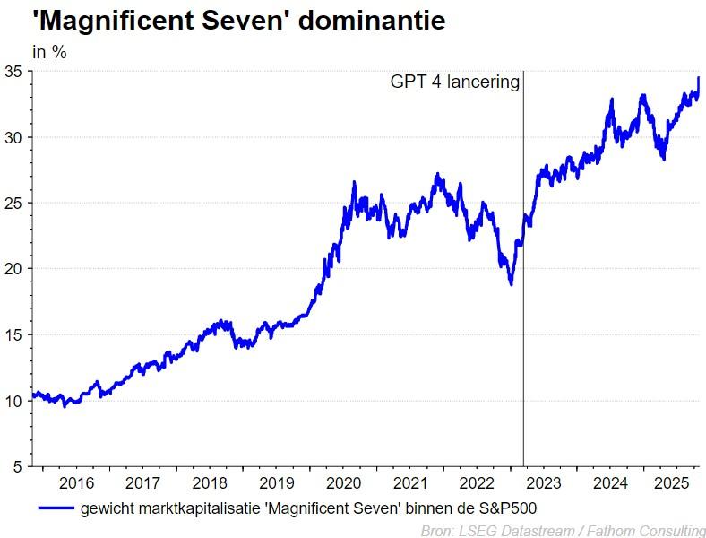 De techreuzen blijven voor schommelingen op de beurs zorgen. De kwartaalcijfers van grote Amerikaanse techbedrijven veroorzaakten forse koersbewegingen. Alphabet (Google) overtrof de verwachtingen met meer dan $100 miljard omzet, terwijl Meta en Microsoft teleurstelden. Meta daalde 11% na een forse afschrijving, en Microsoft verloor 3% door kosten rond AI-investeringen. De Nasdaq en S&P 500 reageerden heftig. De resultaten zetten vraagtekens bij de houdbaarheid van de ‘Magnificent Seven’-rally. Niettemin blijven deze 7 aandelen meer dan 30% van de totale marktwaarde van de S&P 500 uitmaken. De grens van 35% ligt op een zucht (zie grafiek). Waar eindigt dit?