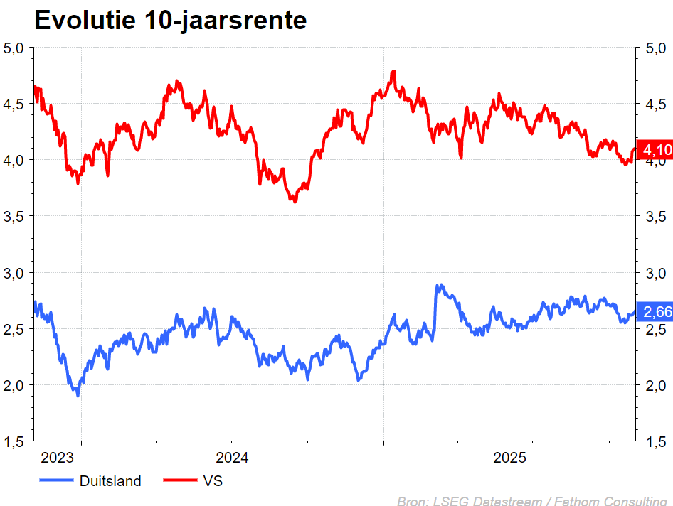 De Duitse 10-jaars Bundrente daalde in de maand tot ongeveer 2,55 % op 21 oktober. Investeerders zochten veiligere havens vanwege twijfels rond de hoogte van de Amerikaanse schulden en de wereldwijde groei. Ook de Franse rente kon herstellen na de piek van 3.60% en daalde tot 3.30%. Toch blijft de langetermijnrente gevoelig voor stijgende overheidsschulden en de politieke instabiliteit in landen als Frankrijk. Tegen het einde van oktober trad terug een lichte stijging van de rente op en de Bundrente keerde terug naar niveaus net onder 2.65% . De rentecurve in de eurozone bleef vrij stabiel.