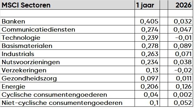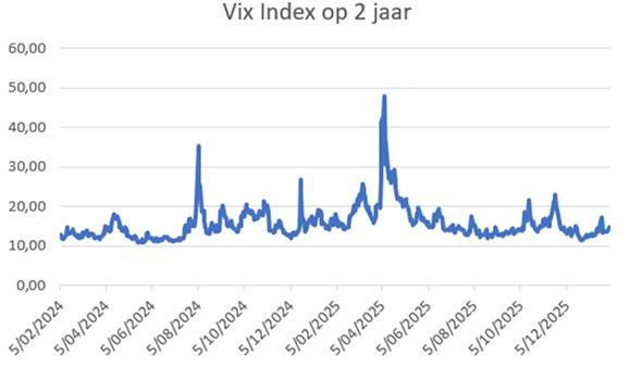 Een opvallend onderdeel van januari was de terugkeer van de volatiliteit. De VIX index, een soort thermometer voor onrust op de Amerikaanse aandelenmarkt, schoot midden in de maand duidelijk omhoog, een gevolg van de tariefdreiging en belangrijke economische cijfers. Toen Trump later in Davos de rust terugbracht door de tarieven uit te stellen, daalde de index weer richting een meer normaal niveau. Toch bleef de volatiliteit hoger dan in december, waardoor beleggers de markt als minder voorspelbaar hebben ervaren.