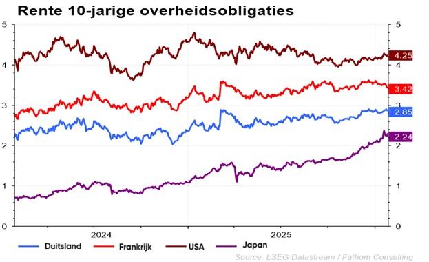 De echte marktschok kwam echter uit een andere hoek: politieke en fiscale onzekerheid. Berichten over belastingplannen en toenemende uitgaven in de aanloop naar verkiezingen leidden tot bezorgdheid dat Japan méér schuld moet uitgeven, precies op het moment dat de BoJ een minder krachtig anker is dan voorheen. Beleggers eisten daarom een hogere fiscale risicopremie, wat de Japanse rente omhoogduwde en daarmee wereldwijd rentes in beweging bracht.