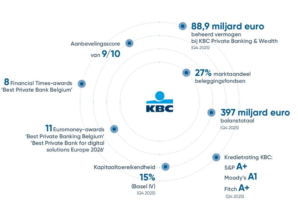 Op 6 november 2025 werden in Londen de Global Private Banking Awards 2025 uitgereikt. Jaarlijks delen de vakbladen Professional Wealth Management en The Banker, die allebei deel uitmaken van de Financial Times deze awards uit. KBC Private Banking werd daar voor de 8de keer bekroond tot 'Best Private Bank in Belgium'. Ze wist de internationale vakjury te overtuigen door het accent op de unieke blend van mens en technologie. Met andere woorden: tijd nemen voor een goed gesprek ondersteund door efficiënte technologie.